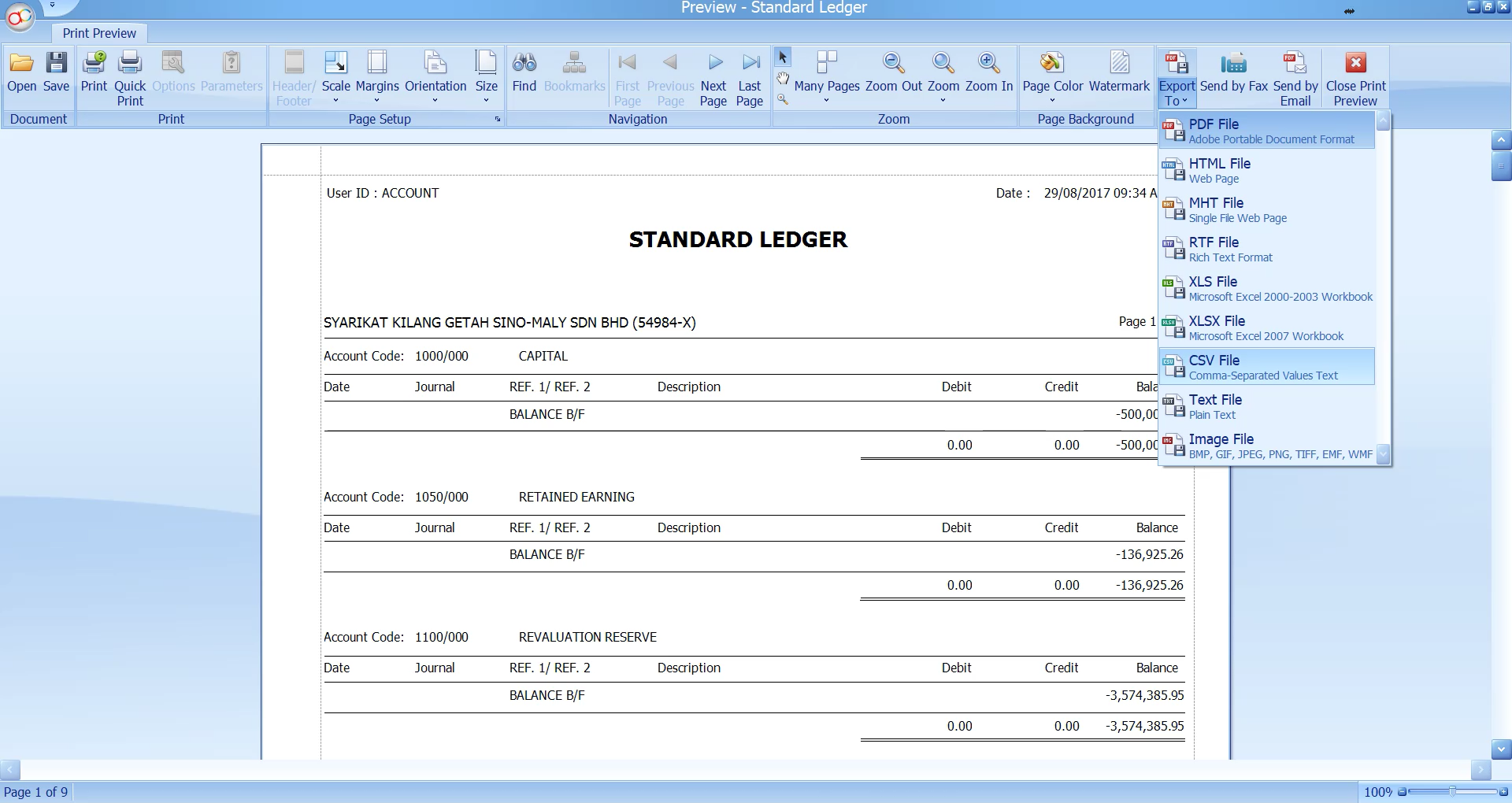 Select date range of the general ledger, click on "inquiry" and preview ledger and select standard ledger format